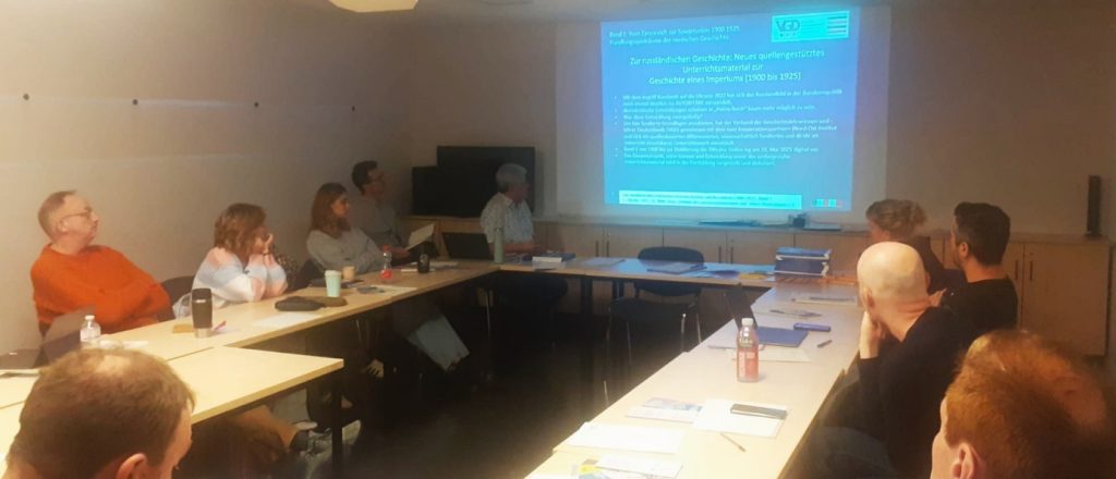 Im zweiten Teil der Fortbildung vermittelte Dr. Peter Stolz vom Landesverband Berlin des VGD zahlreiche und differenzierte Informationen (PowerPoint-Präsentation, Materialvorschläge etc.) zur fachwissenschaftlichen und fachdidaktischen Arbeit mit dem neuen Band 1, Zwischen Revolution und Reform: Vom Zarenreich zur Sowjetunion (1900–1925).